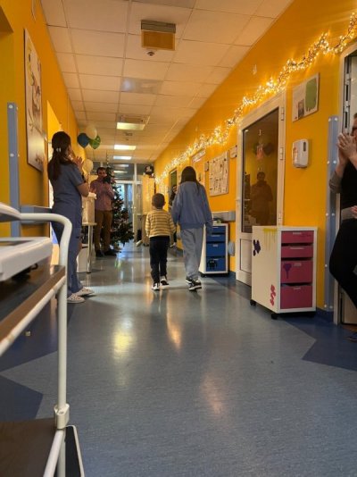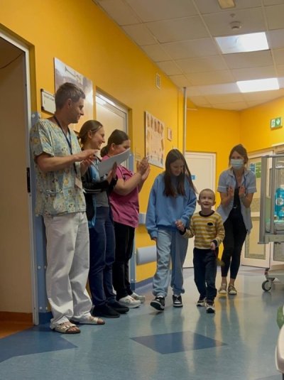Nadszedł długo wyczekiwany dzień, kiedy dzielny Onkobohater Oliwier zakończył intensywną fazę leczenia i opuścił szpital. Chłopiec, przemierzając szpitalny korytarz z dzwoneczkiem w dłoni, dzielił swoją radość zarówno z rodziną, innymi małymi pacjentami, ich bliskimi jak i całym personelem medycznym.